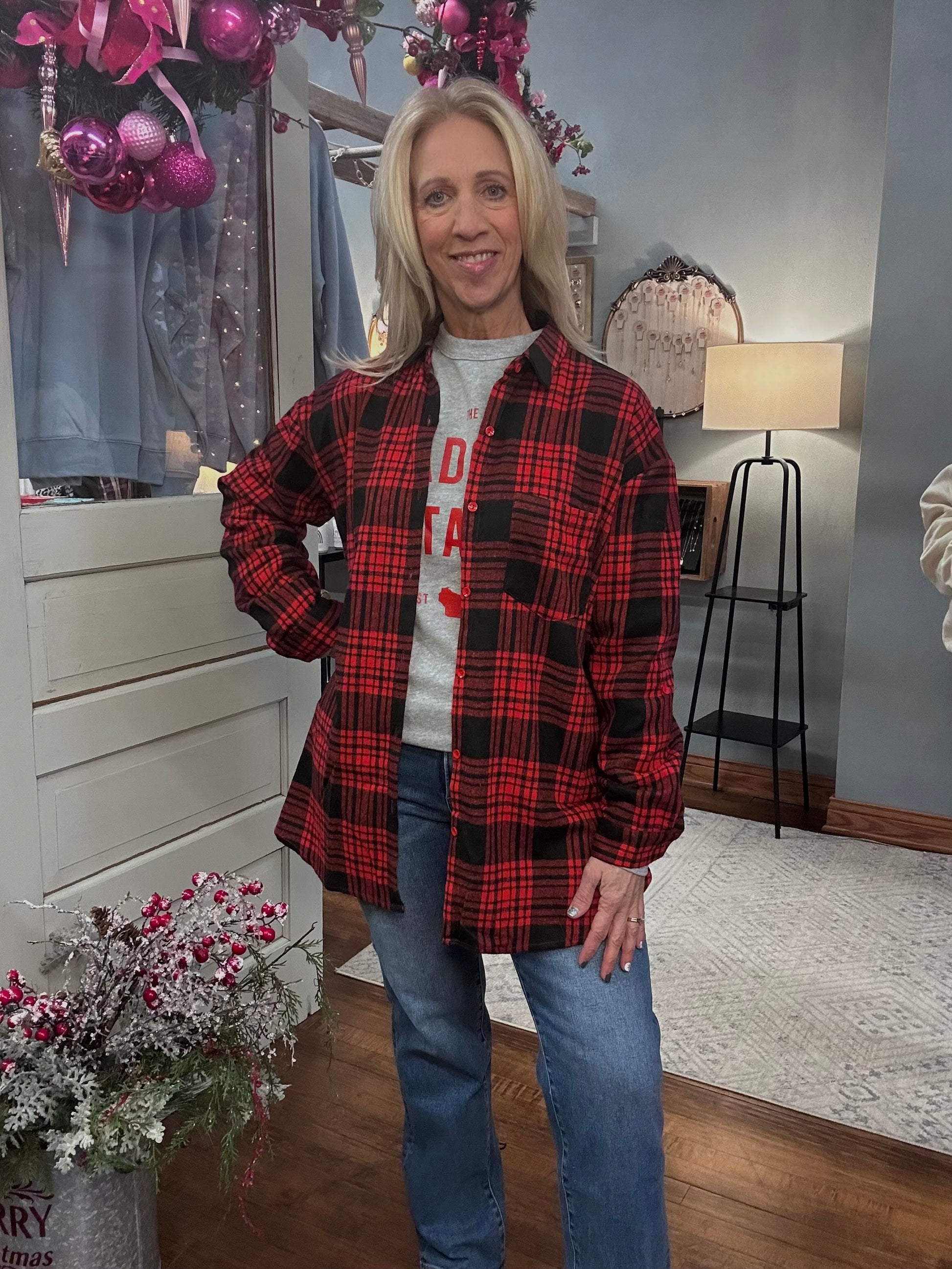 Beer, football, & flannels! This long sleeve, drop shoulder, oversized plaid checkered shirt is perfect for the fall season.