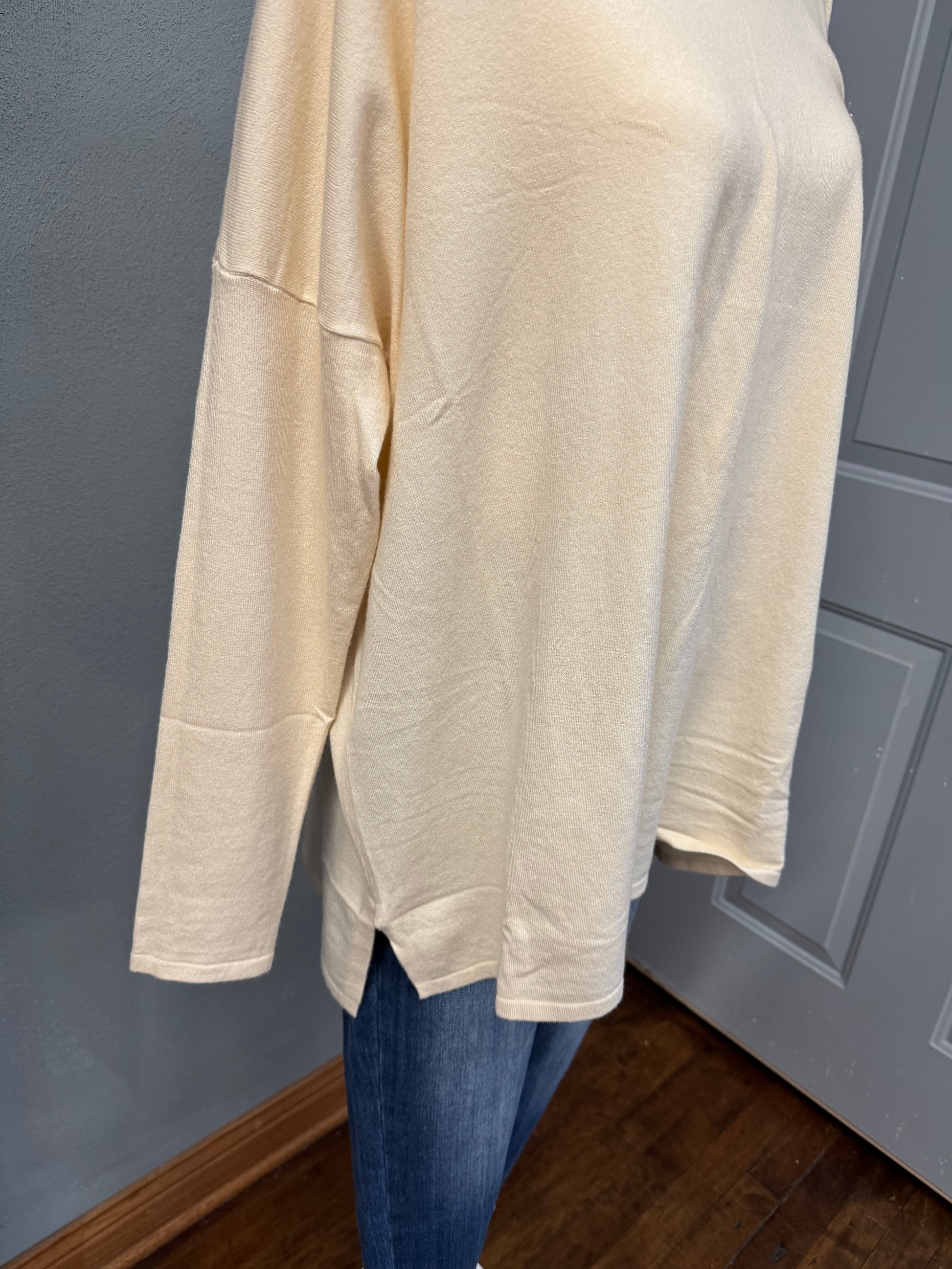 Soft Touch Drop Shoulder Sweater with side cut out. High low and oversized fit.