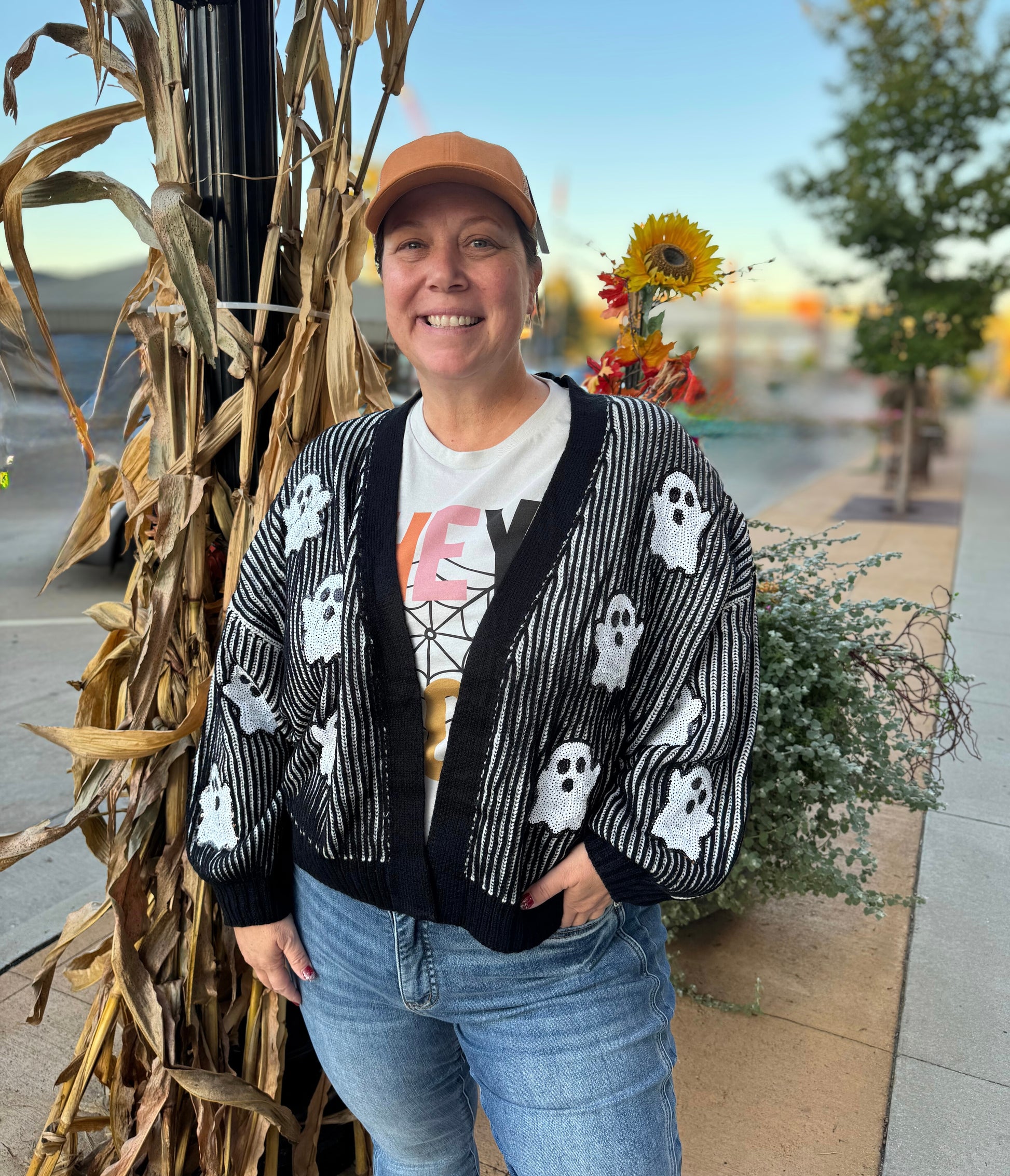 Get festive with this adorable black and white two tone knit cardigan with sequin ghost patches.