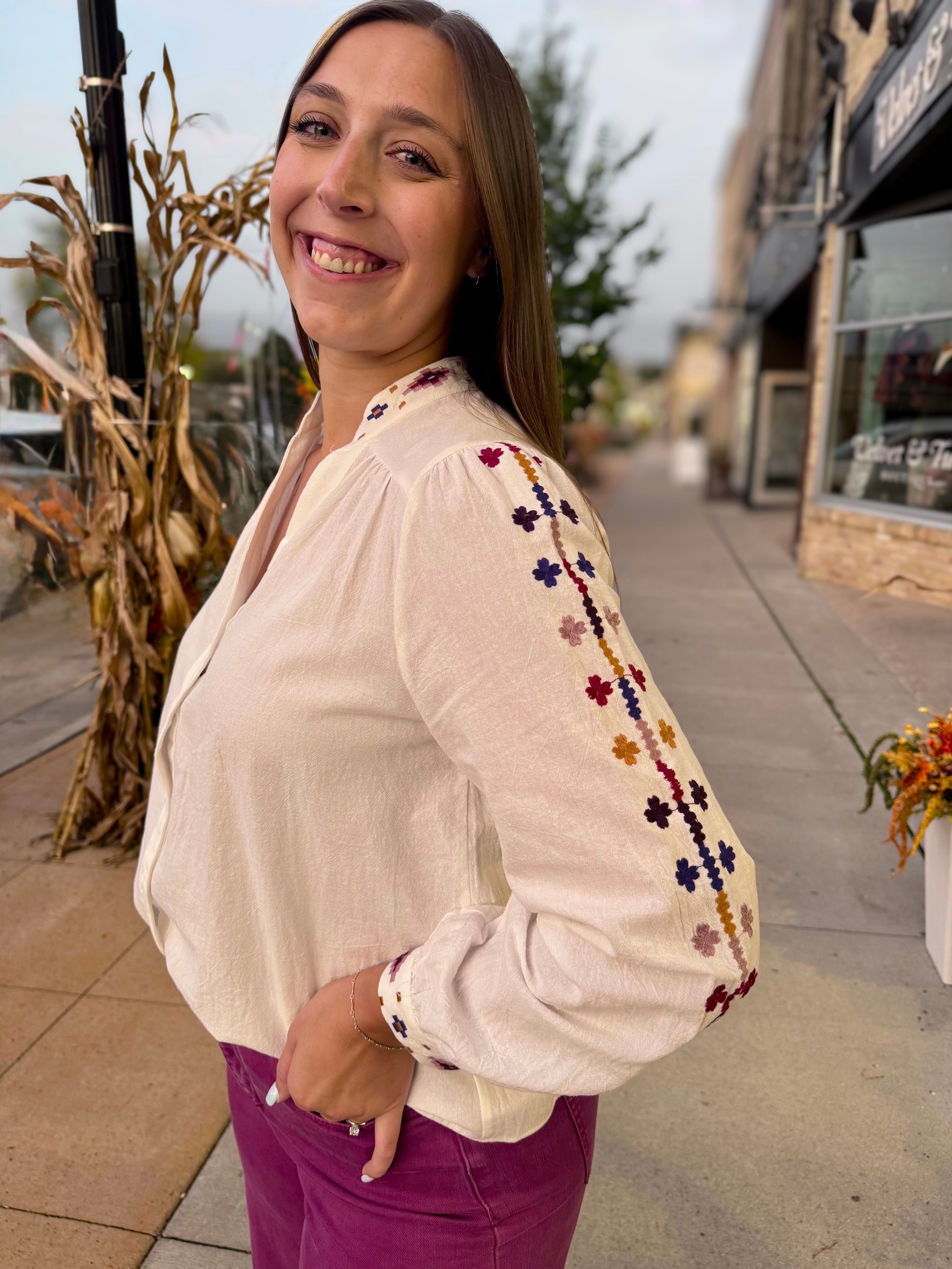 Beautiful cotton blouse featuring a v-neckline, long sleeves, and delicate embroidery down the sleeves.