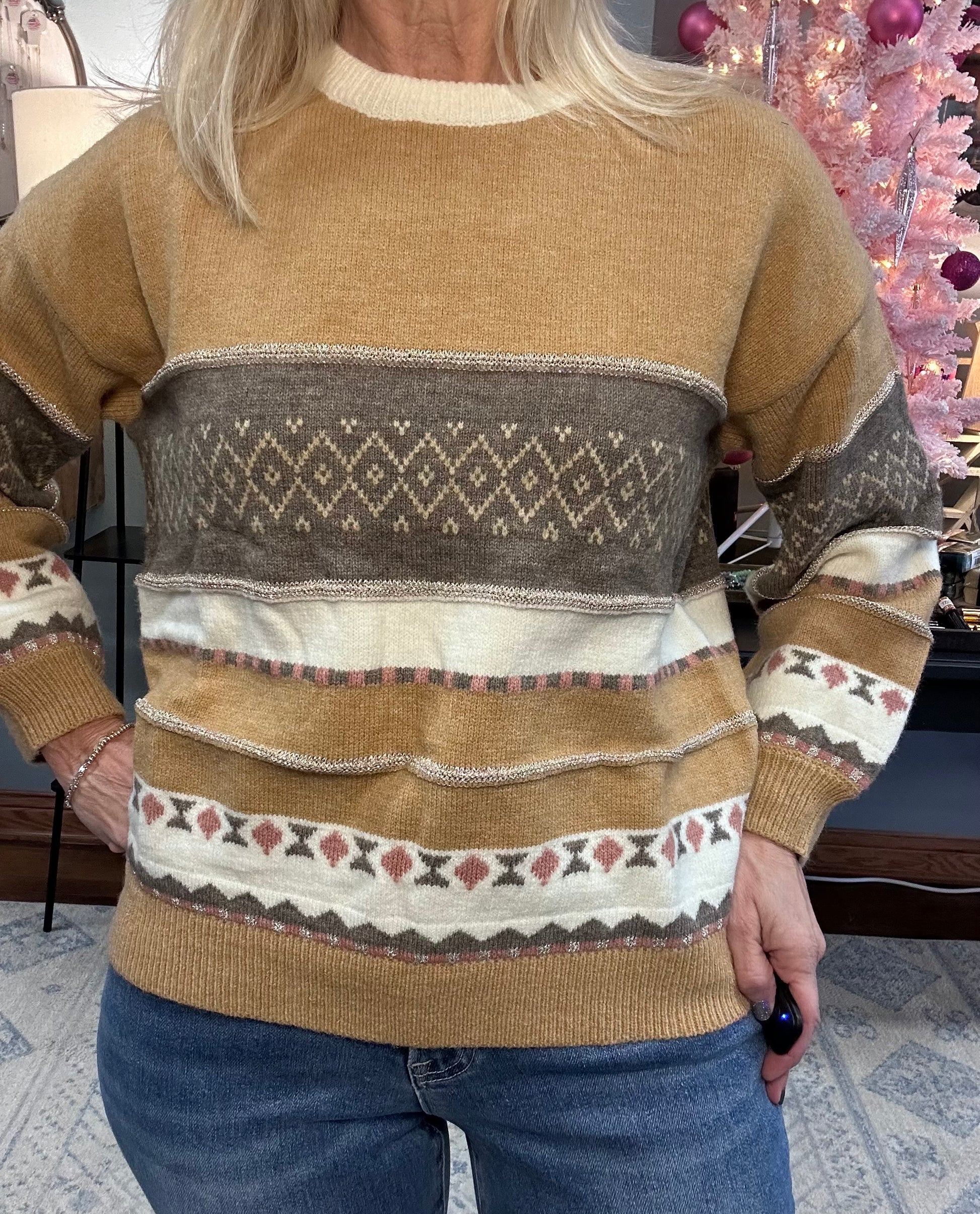 Taupe combo sweater featuring a crew neckline, long sleeves, and subtle pattern detailing.