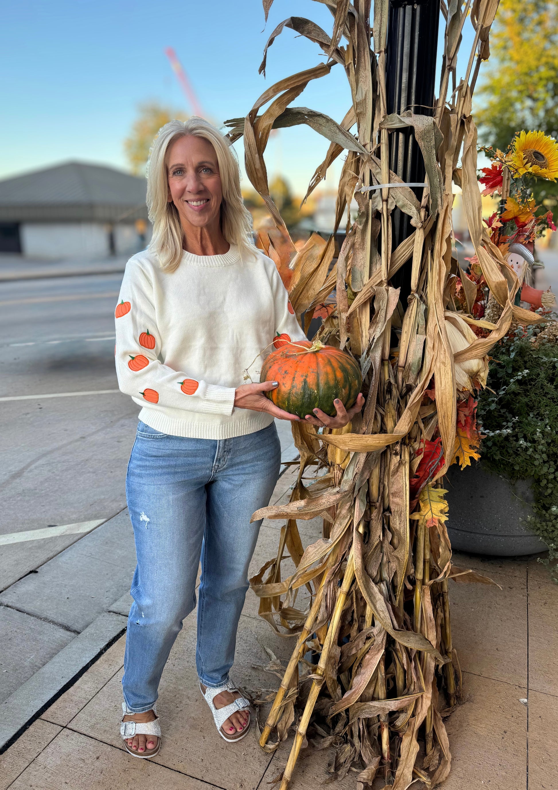 Nothing says ready for fall like this sweater! Ivory long sleeve sweater top with pumpkin applique embroidered.