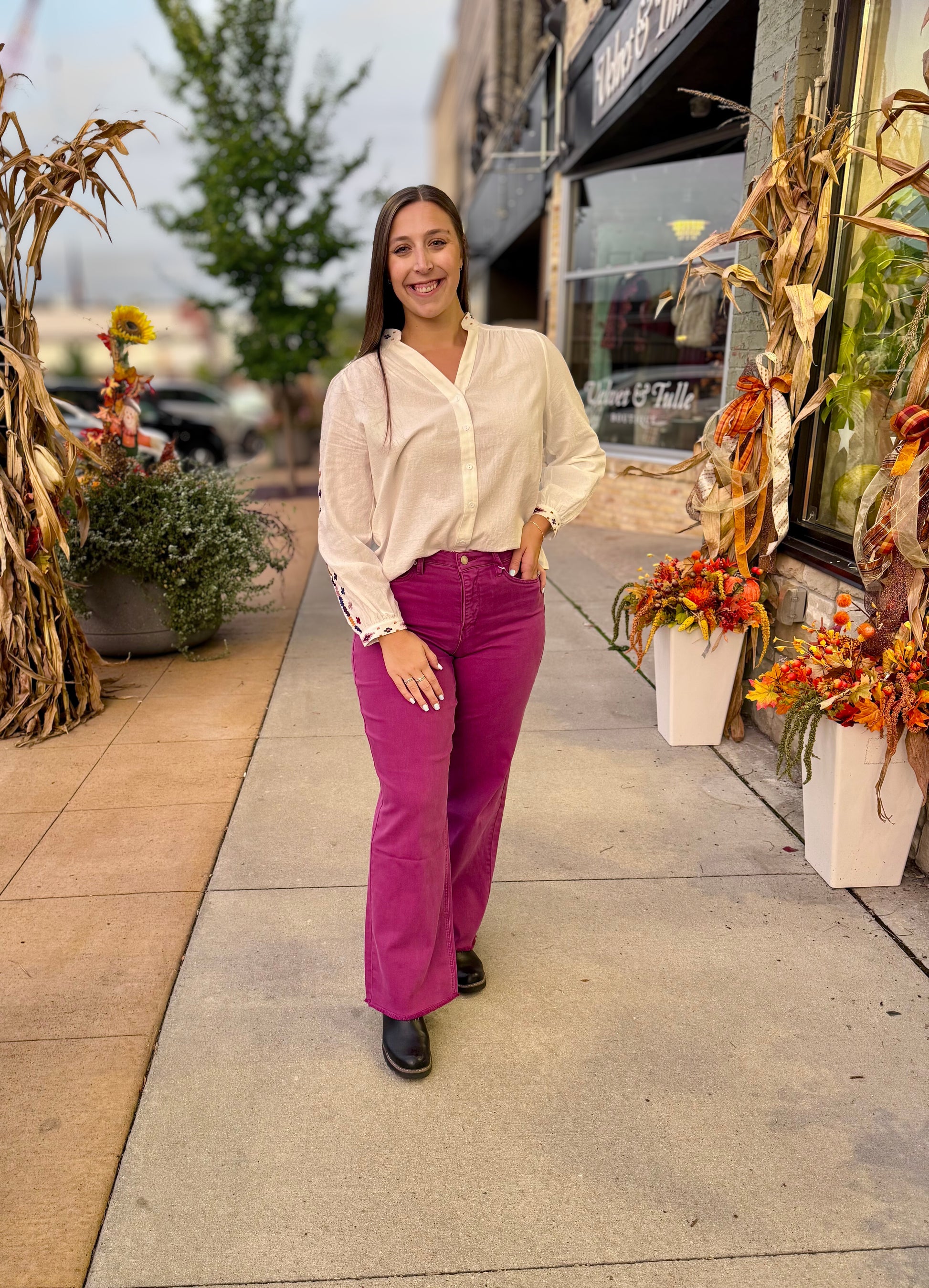 Magenta high-rise pants with a wide leg that offers a bold and stylish look. Frayed hem at bottom of pant with built-in tummy control panels. Inseam: 32" Rise: 11" Leg Opening: 21"