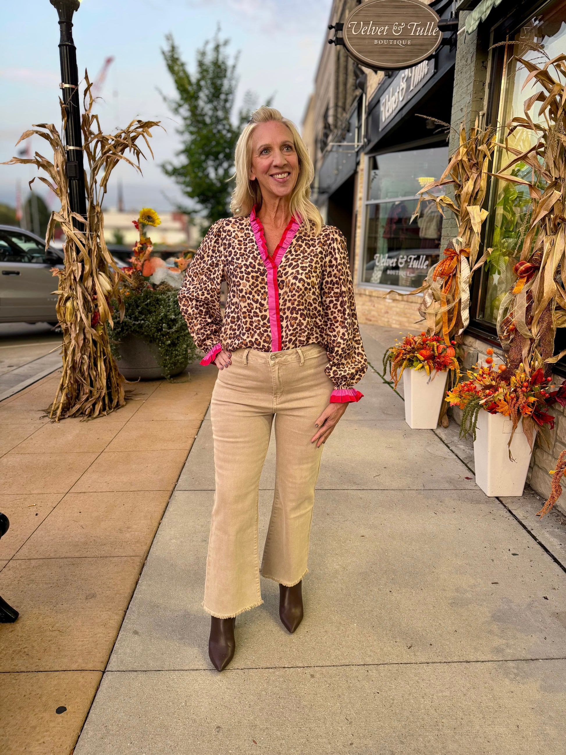 Feeling bold and want to wow people? Wear this adorable leopard print long sleeve top with stripe wavy trim detail.