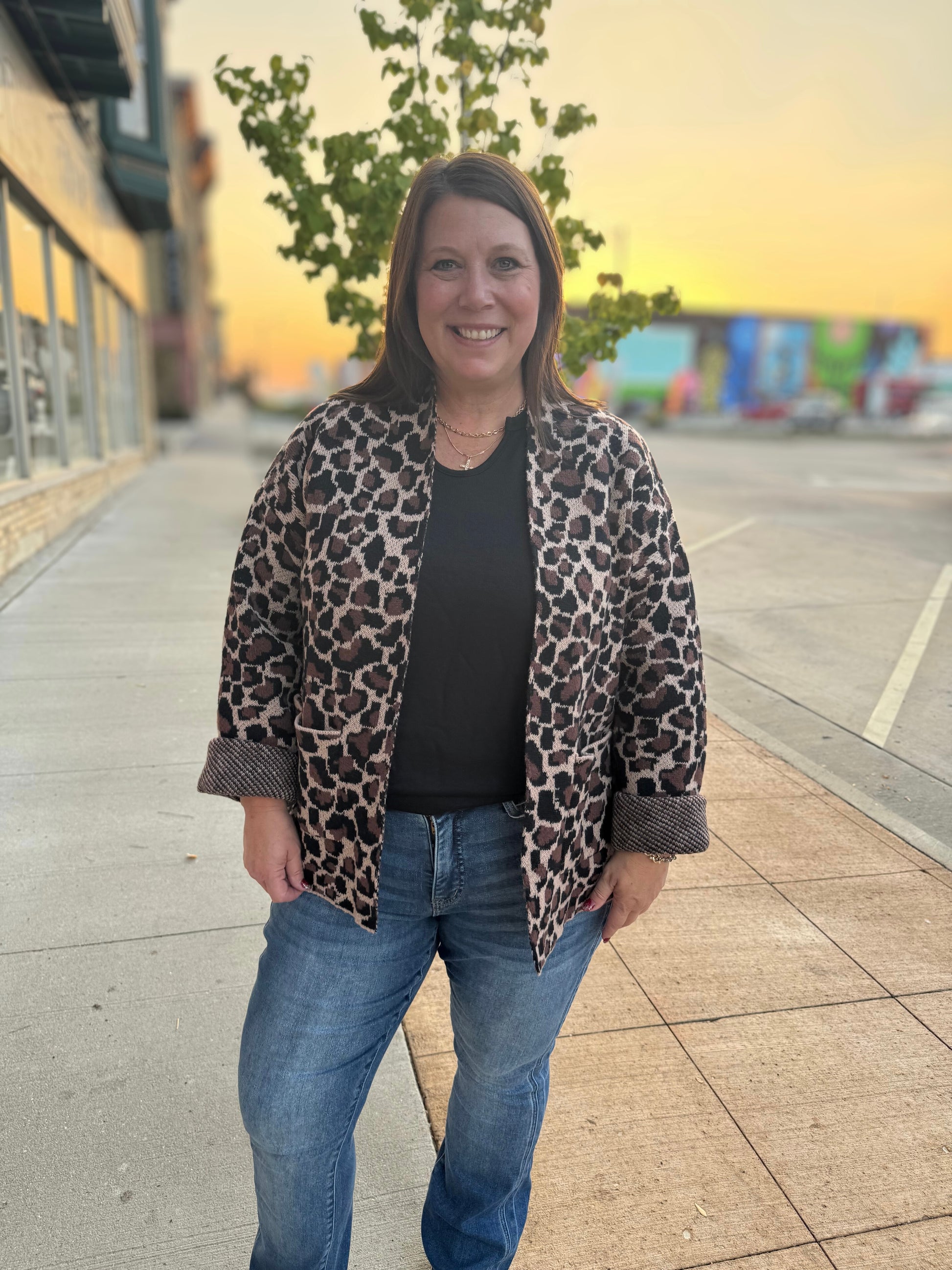 Knit cardigan with open front and leopard mocha detail, front pockets.