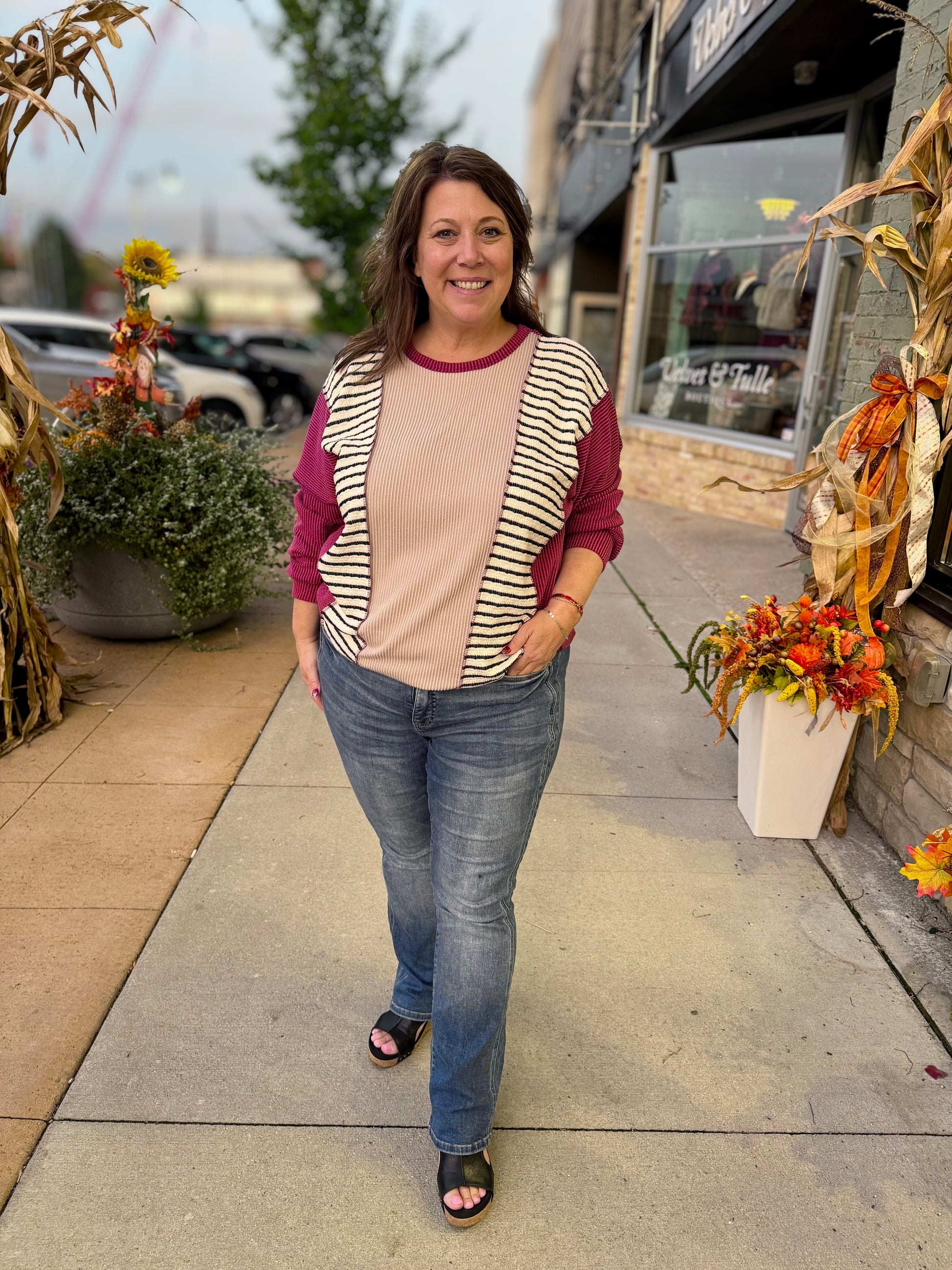 Long sleeve round neck solid urban rib with jacquard stripe. Color block knit top